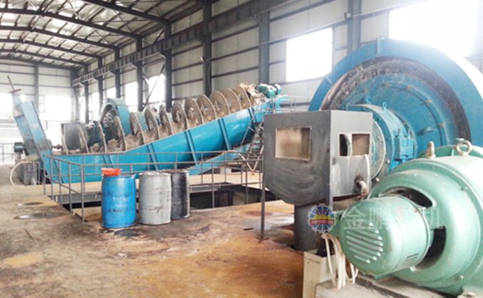 本工藝采用兩段一閉路破碎流程,合格產(chǎn)品進入粉礦倉緩存,礦石由擺式給礦機均勻的給到直筒節(jié)能格子型球磨機進行磨礦,格子球磨機和高堰式單螺旋分級組成一段閉路磨礦分級流程。球磨機的排礦先經(jīng)過跳汰機富集大顆粒金,跳汰機底流通過兩段搖床選出30%品位的顆粒金,跳汰機的溢流進入分級機。分級溢流經(jīng)過攪拌槽的調(diào)漿后進入浮選系統(tǒng),通過做礦石的可選性實驗研究我們選擇一粗三精三掃的浮選流程,從而很大程度的回收脈石中的有價金元素。浮選金精礦通過濃密機濃縮由過濾機完成脫水作業(yè),浮選尾礦由濃密機濃縮后進入壓濾機進行壓濾成濾餅做到尾礦干排。金礦重浮聯(lián)合流程也是金鵬集團用于山東黃金集團蓬萊大柳行選廠項目中的成功經(jīng)驗。