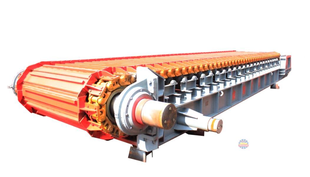 采用節(jié)距為228.6mm的高強度模鍛鏈條為牽引件,兩根鏈條繞過安裝在機體頭部的一對驅(qū)動鏈輪和機體尾部的一對張緊輪聯(lián)成封閉形回路,在兩排鏈條的每個鏈節(jié)上裝配了相互交迭的、重型結(jié)構(gòu)的輸送槽而成為一個連續(xù)的能夠運載物料的輸送線路。其自重和物料的重量由安裝在機體上的多排支重輪、鏈托輪和滑道梁支承。傳動系統(tǒng)經(jīng)交流變頻調(diào)速電動機聯(lián)接減速機,再由漲套與驅(qū)動裝置直聯(lián)驅(qū)動運載機構(gòu)低速運行。將尾部料倉卸入的物料沿輸送線路運至機體的前方排出,實現(xiàn)向下方的工作機械連續(xù)均勻喂料的目的.