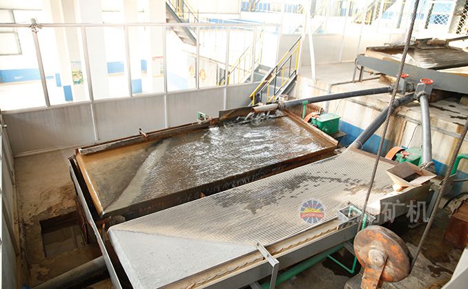 礦粒群從6s搖床床面上角的給礦槽送入,同時(shí)由給水槽供給橫向沖洗水,于是礦粒在重力,橫向流水沖力,床面作往復(fù)不對(duì)稱運(yùn)動(dòng)所產(chǎn)生的慣性和摩擦力的作用下,按比重和粒度分層,并沿床面作縱向運(yùn)動(dòng)和沿傾斜床面作橫向運(yùn)動(dòng)。比重和粒度不同的礦粒沿著各自的運(yùn)動(dòng)方向逐漸扇形流下,分別從搖床精礦端和尾礦側(cè)的不同區(qū)排出,最后被分成精礦,中礦和尾礦。